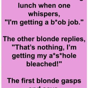 Two blondes are having lunch when one whispers, I’m getting a boob job.”Two blondes are having lunch when one whispers, The other blonde replies, “That’s nothing, I’m…