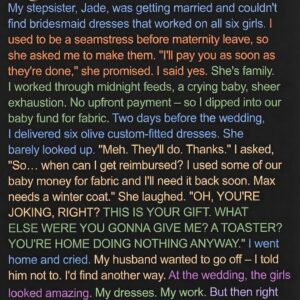 When my stepsister Jade called to ask if I could sew six custom bridesmaid dresses for her upcoming wedding, I hesitated but agreed, hoping the project might…
