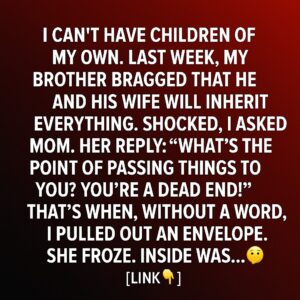 At a family dinner, my brother smugly announced he and his wife would inherit everything “because they have kids.”I turned to my mother for backup—and she cut…
