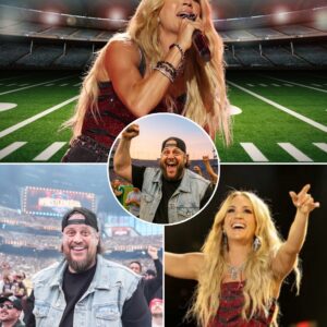 THE STAGE EXPLODES! Carrie Underwood returns to open “Sunday Night Football” for the 13th consecutive year, turning the stadium into a sea of explosive music. From the moment she sang her first song, tens of thousands of spectators stood up, cheering like a tsunami rolling across the stands. With her powerful voice and fiery style, Carrie turned the football match into a wild rock-country party, giving millions of people “goosebumps” before her eye-catching performance. But the biggest surprise was that in a far corner of the stands, fans caught sight of Jelly Roll – the country music star – also joining in the excitement, standing up to cheer enthusiastically for Carrie. His secret appearance made the already hot atmosphere even more turbulent than ever!
