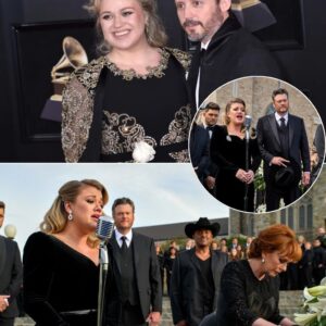 The First Baptist Church in Fort Worth, Texas, was filled with quiet grief. Gray clouds hung low, and soft light slipped through the stained-glass windows. Brandon Blackstock lay peacefully in a polished walnut coffin. Before it was carried inside, Kelly Clarkson paused at the church steps. Her voice was shaky, eyes red. “Let me sing for him… to comfort my mom and my kids,” she whispered. Then she began Because You Loved Me, her voice carrying on the morning wind. Blake Shelton stood still beside her, eyes wet, while Michael Bublé placed a steadying hand on her shoulder. Near the casket, Reba McEntire, in a long black gown and veil, sank to her knees. Her hands trembled on the wood as tears fell. “I’m sorry I couldn’t protect you more,” she sobbed. The crowd lowered their heads, giving her space to mourn her stepson as if he were her own.